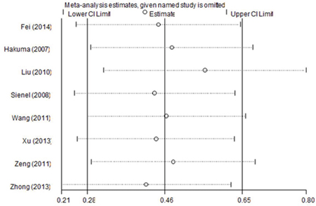 To examine the robustness of the results, sensitivity analysis by sequential omission of each included study was conducted. As shown in Figure 4, the pooled HR and 95% CI were not substantially altered, which indicated the credibility of our results.