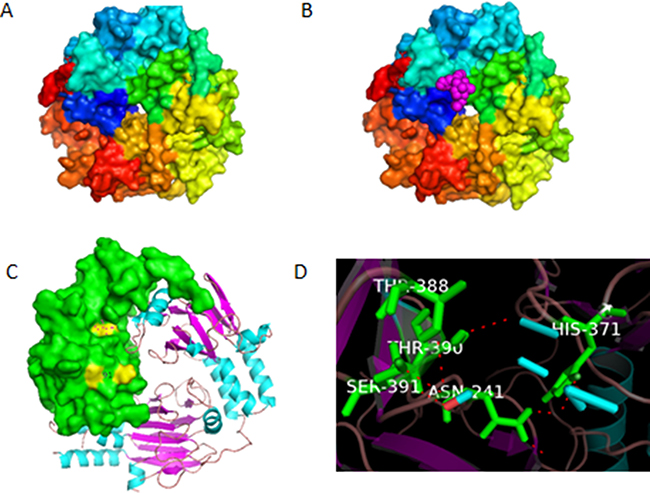 Figure 1: (A) Conformation of smad3/4 complex without homoharringtonine (HHT). (B) Docked conformation of smad3/4 with HHT, the ligand HHT is indicated by the pink molecule. (C) The estimated residues that bind with HHT, shown in yellow color, analyzed by Pymol. (D) Name of the residues for binding.