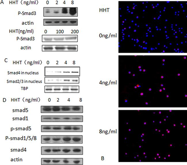 Figure 2: Activation of TGF-β pathway by HHT. (A) Change of phosphorylated-smad3 at Ser425/427 in U937 cells (upper) and KG-1 cells (lower) upon concentration gradient of HHT; (B) Translocation of smad4, red fluorescence indicates smad4, blue fluorescence stands for nucleus stained by DAPI. (C) Protein level of smad2/3 and smad4 in nucleus. (D) Change of smad1/5/8 upon HHT treatment.