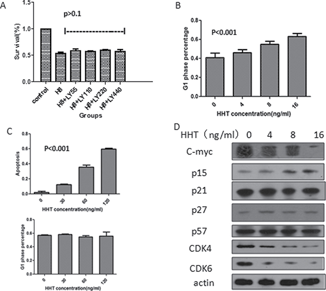 Figure 3: Influence of activation of TGF-β pathway on AML cell line survival. (A) Survival of U937 cells after been treated by HHT and TbRI /TbRII inhibitor LY2109761 for 24 h (H8 means HHT 8 ng/ml, LY55 means LY2109761 55 nM, LY110 means LY2109761 110 nM, LY220 means LY2109761 220 nM, LY440 means LY2109761 440 nM). (B) G1 phase cell percentage of U937 cells measured by flowcytometry after treated by different concentrations of HHT, cells stained by Annexin V/PI. (C) Apoptosis (upper) and G1 phase cell percentage (lower) of KG-1 cells following HHT treatment at different concentrations for 24 h, detected by flowcytometry. (D) Protein level change of the downstream molecules following HHT treatment for 24 h at different concentrations.