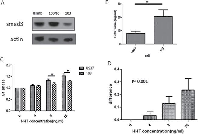 Figure 4: Effects of smad3-shRNA transfection on cell behavior. (A) Change of protein level of smad3 after transfection. (103NC means U937 cells transfected with empty vectors, 103 means U937 cells transfected with smad3-shRNA) (B) Change of IC50 of HHT on cells before (U937, left lane) and after (103, right lane) transfection. (C) G1 phase percentage of U937 and 103 cells under different concentrations of HHT. (D) Decreasement of cell G1 phase percentage after transfection at 24 h. The y axis represents G1 phase percentage of U937 cells minus that of 103 cells under the given HHT concentrations.