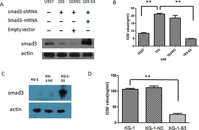 Figure 5: Effects of smad3 re-expression and over-expression in AML cell lines. (A) Level of smad3 after knock-down and re-expression in U937 cells by western blot. (B) IC50 values of the cells with and without transfection. 103 refers to U937 cells transfected with smad3 shRNA, 103NC refers to 103 cells transfected with empty vectors, 103-S3 refers to 103 cells transfected with smad3 mRNA. (C) Protein level of smad3 in KG-1 cells following smad3 over-expression. KG-1-NC refers to KG-1 cells transfected with empty vectors, KG-1-s3 refers to KG-1 cells transfected with smad3-mRNA vectors. (D) IC50 values of KG-1 cells before and after smad3 mRNA transfection.