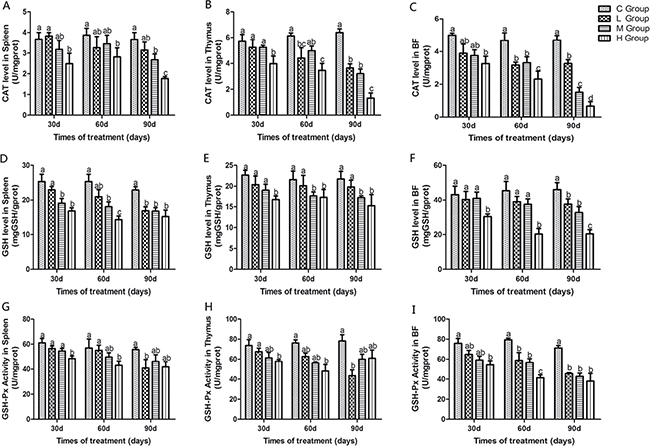 Figure 1: Effects of As2O3 on activities of CAT, GSH and GSH-Px at 30, 60 and 90 days. Bars sharing a common letter are not significantly different (P > 0.05) in the same group. Each value represents the mean ± SD (n = 6).