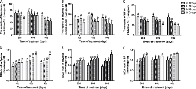 Figure 2: Effects of As2O3 on ability of inhibition OH. and content of MDA at 30, 60 and 90 days Bars sharing a common letter are not significantly different (P > 0.05) in the same group. Each value represents the mean ± SD (n = 6).