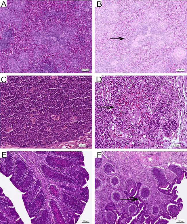 Figure 3: Representative photomicrographs of H&E-stained immune organs at 90 days Control group from spleen (A), thymus (C) and BF (E), high-As2O3 group from spleen (B), thymus (D) and BF (F) (×400) Black arrows stand for decreased lymphocytes, infiltration of heterophils in thymus and obvious atrophy of follicles in BF. Scale bars - 100 μm (a, b, e and f ), 50 μm (c and d).