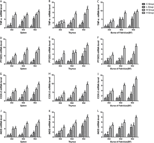 Figure 4: Effects of As2O3 on mRNA expression of TNF-α, PTGEs, COX-2, iNOS gene at 30, 60 and 90 days. Bars sharing a common letter are not significantly different (P > 0.05) in the same group. Each value represents the mean ± SD (n = 6).