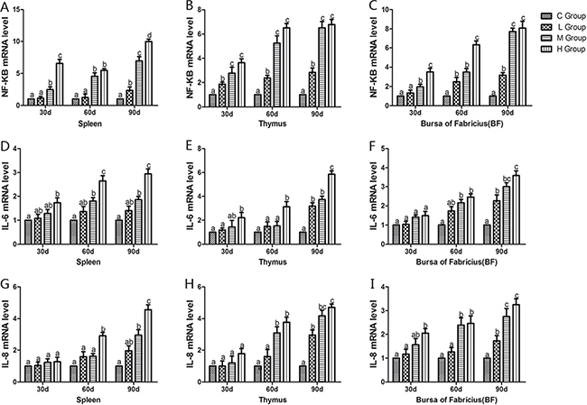 Figure 5: Effects of As2O3 on mRNA expression of NF-κB, IL-6 and IL-8 gene at 30, 60 and 90 days. Bars sharing a common letter are not significantly different (P > 0.05) in the same group. Each value represents the mean ± SD (n = 6).