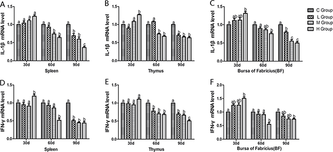 Figure 6: Effects of As2O3 on mRNA expression of IL-1β, IFN-γ gene at 30, 60 and 90 days. Bars sharing a common letter are not significantly different (P > 0.05) in the same group. Each value represents the mean ± SD (n = 6).