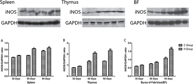 From the 30th to 90th days of age during the experiment, the mRNA levels of TNF-α, PTGEs, COX-2, iNOS, NF-κB, IL-6 and IL-8 were increased dose-dependently in treatment groups in three organs (Figures 4 and 5). Especially, levels in the medium and high-dose groups increased significantly compared with the corresponding control groups (P < 0.05) except the levels of IL-6 in BF as well as IL-8 in spleen and thymus on the 30th day, which showed no significant increase compared with the corresponding control groups (P > 0.05). On the 30th day, the transcriptional levels of IL-1β and IFN-γ in all these three immune organs reached their maximum values in the high-dose groups compared with the control groups (P < 0.05) (Figure 6). On the 60th and 90th days, they displayed decreases in a dose-dependent manner, and they reached the minimum values in the high-dose groups compared with the control groups (P < 0.05). Protein expression level of iNOS was consistent with its mRNA level treated by As2O3 which showed significant increase compared with corresponding control groups in three organs (P < 0.05) (Figure 7).