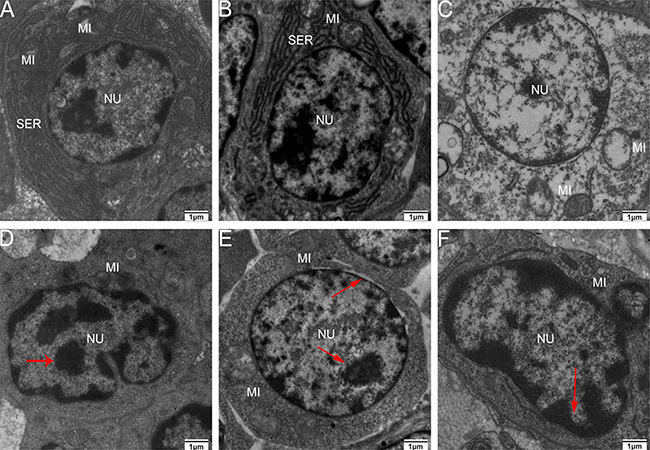 Figure 8: Transmission electron microscopy of immune organs at 90 days of age Control group from spleen (A), thymus (B) and BF (C), high-As2O3 group from spleen (D), thymus (E) and BF (F) (×2000) Red arrows stand for nucleus with lost structural integrity and chromatin condensation. Key: MI, mitochondria; SER, smooth endoplasmic reticulum; and NU, nucleus.