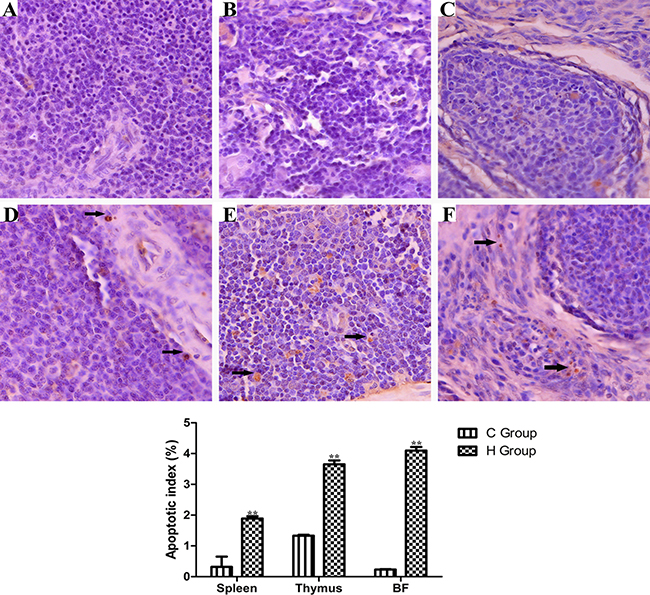 Figure 9: TUNEL staining (counterstained with hematoxylin, ×400) of dimmune organs at 90 days of age Control group from spleen (A), thymus (B) and BF (C), high-As2O3 group from spleen (D), thymus (E) and BF (F) **P < 0.01, compared with the control group. Data are presented with the mean ± SD (n = 6) Black arrows stand for apoptotic cells with brown-stained nuclei.