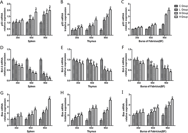 Figure 10: Effects of As2O3 on mRNA expression of p53, Bcl-2 and Bax gene at 30, 60 and 90 days. Bars sharing a common letter are not significantly different (P > 0.05) in the same group. Each value represents the mean ± SD (n = 6).