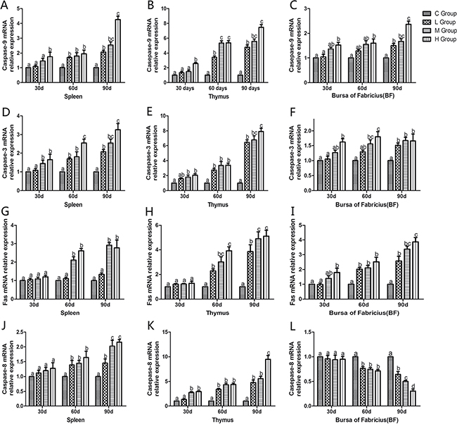 To confirm the role of apoptosis in As2O3-induced injury, qRT-PCR was used to demonstrate change of mRNA levels of apoptosis-related genes in mitochondria apoptosis pathway (p53, Bcl-2, Bax, caspase-9, caspase-3) and death receptor apoptosis pathway (Fas and caspase-8) in As2O3-treated chickens (Figures 10 and 11). The mRNA levels of Bax, caspase-9 and caspase-3 in immune organs were increased dose-dependently on the 60th and 90th days and they increased to the maximum values in high-dose groups compared with the corresponding control groups (P < 0.05). However, the mRNA levels of p53 in spleen, BF and Fas in spleen and thymus, displayed no significant increases on the 30th days compared with the corresponding control groups (P > 0.05). The mRNA level of Bcl-2 in immune organs decreased at each As2O3 concentration and decreased to the lowest value in high-dose groups significantly compared with the corresponding control groups (P < 0.05). The mRNA level of caspase-8 in the BF was decreased dose-dependently, interestingly, it showed significant differences in the other two organs, which showed increased in a dose-dependent manner compared with the corresponding control groups (P < 0.05).