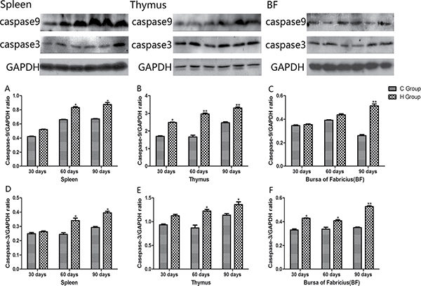 To observe the time-dependent dynamic change, we chose three time points (30, 60 and 90 days of age) for examining histopathological injury, immune, antioxidant and apoptosis parameter changes. On the 30th, 60th, and 90th days, six chickens in each group were selected randomly. Chickens were anesthetized and euthanized using injection of sodium pentobarbital (30 mg/kg BW), immune organs (spleen, thymus, and BF) were immediately excised, rinsed with ice-cold 0.9% NaCl solution. They were dried on filter paper and then marked.