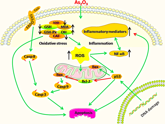 Figure 14: Diagram depicts the toxic effect of arsenic trioxide on chicken immune organs: Mitochondria and death receptor apoptosis pathways are activated because of excessive apoptosis in immune organs of chickens suffering from subchronic arsenism, and oxidative stress as well as subsequent inflammatory is a crucial driver during As2O3 exposure. Green arrows mean promotion, red arrows mean inhibition. “↑”means up-regulation, “↓”means down-regulation.