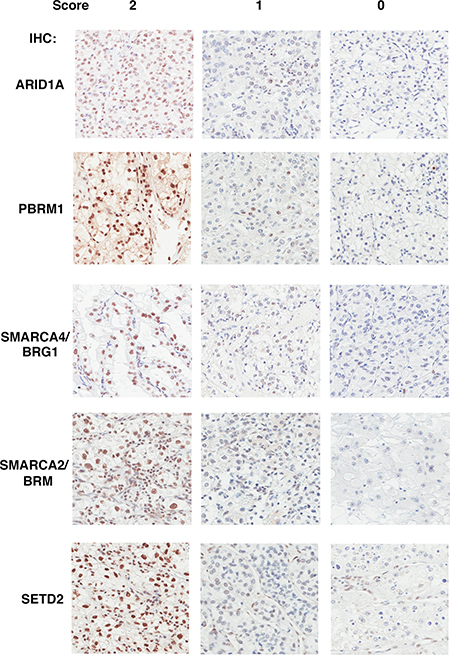 Figure 1: The Immunohistochemical analysis of ARID1A, PBRM1, SMARCA4, SMARCA2, SETD2 in ccRCC foci. Representative foci stained for different markers showing scores of 2, 1, 0 (left, middle, and right). The staining of stromal and immunological cells serves as internal positive controls.