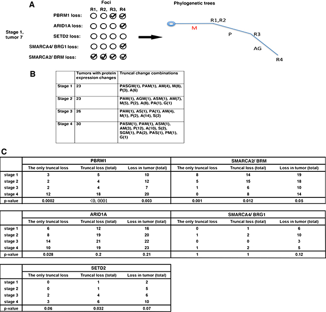 Figure 2: The truncal loss analysis revealed hidden links between protein loss and tumor stages. (A) How a phylogenetic tree was constructed. A: ARID1A loss; M: SMARCA2 loss; P: PBRM1 loss, G: SMARCA4 loss; S: SETD2 loss. (B) Truncal losses of the markers at each stage, either alone or in combination, were presented. (C) Fisher’s exact tests were performed to calculate the p values of the associations between the protein marker losses and stages.