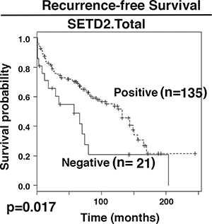 It is not known whether truncal losses of protein markers would reveal statistically different associations with patient survival than those of total losses. Cox proportional hazards (PH) models were utilized to correlate recurrence-free survival (RFS) with biomarker losses. For the protein losses, two groups of protein losses were used for analysis: one included all the truncal losses (Proteinname.Truncal). The other one included all the protein losses (Proteinname.Total). In univariate analyses, SETD2.Total, SMARCA2.Total, SMARCA4.Truncal, and SMARCA2.Truncal displayed a significant association with RFS with p values near or below 0.05 while SMARCA4.Total and SETD2.Truncal showed marginally significant associations (Table 3). In further multivariable analysis, only SETD2.Total’s association with RFS remained statistically significant. The Kaplan-Meier curve showed that patients that lost SETD2 staining in tumors had shorter RFS (Figure 3). Thus, most of the markers do not appear to be associated with RFS and the ITH analysis did not help.