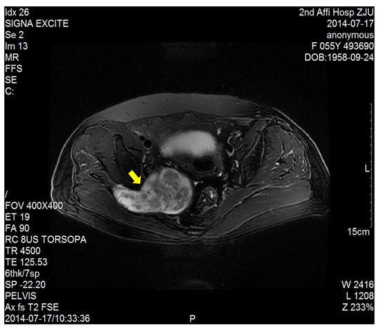 Figure 2: T2-weighted image showed a right sacral mass as a dumbbell-shaped configuration and mixed low signal intensity on the basis of high signal intensity.