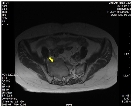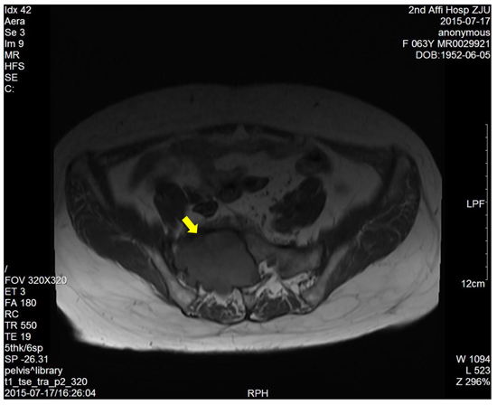 Figure 4: T1-weighted image showed a right sacral mass with low signal intensity.