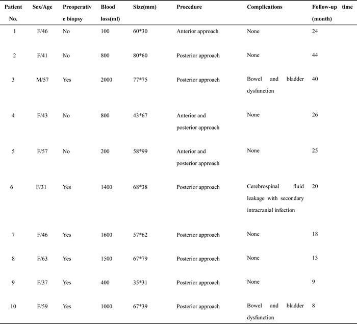 Between December 2012 and September 2016, 11 sacral schwannoma patients were operated at Department of Orthopaedic Surgery, the Second Affiliated Hospital, School of Medicine, Zhejiang University. Finally, 10 were fully followed up and one was lost to follow-up.