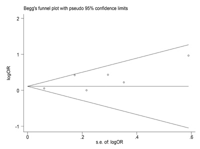 Figure 4: Begg’s funnel plot to examine publication bias in allele of MMP2-1306C/T polymorphism. Each circle corresponds to one study, and indicated that no publication bias existed.