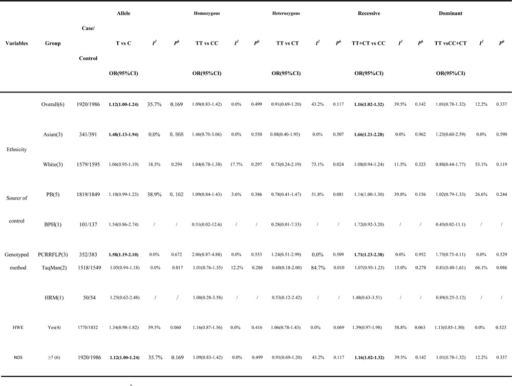 Subgroup analyses underlying the ethnicity, source of control and genotyped method were carried out. As a result, a certain association was detected in Asian population (T vs C: OR = 1.48, 95% CI = 1.13-1.94, P = 0.004; TT+CT vs CC: OR = 1.66, 95% CI = 1.21-2.28, P = 0.002; respectively) and in PCR-RFLP genotyped method (T vs C: OR=1.58, 95% CI= 1.19-2.10, P = 0.001; TT+CT vs CC: OR=1.71, 95% CI=1.23-2.38, P = 0.001; respectively). Conversely, there were no significant associations among other subgroups (Table 2).