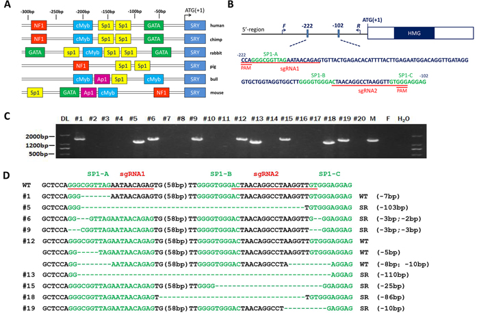Figure 1: Generation of the SRY-Sp1 KO, XY rabbits using the Cas9/gRNA system. A. Schematic representation of the positions corresponding to the different potential regulatory elements identified in the 5’ flanking region of the SRY gene of different species. Identified putative binding sites are indicated by different colored boxes on the sequence, indicating a position in the sense or antisense strand. B. Schematic diagram of the 2 sgRNA target sites in the Sp1 binding site located upstream of the SRY locus. The Sp1 binding sites are indicated in green. sgRNA target sites are underlined and highlighted in red. F and R represent the PCR primer pairs used for mutation detection. C. Mutation determination of the SRY-Sp1 KO, XY newborn rabbits by PCR. Primers used were SRY-F and R (Supplementary Table S1). DL, DNA marker III. F: wild type female rabbit; M: wild type male rabbit. D. T-cloning sequences of mutant alleles in SRY-Sp1 KO newborn rabbits. The target sequences are underlined in red; the Sp1 binding sites are green; deletions (-) and insertions (+) are shown. WT, wild type control.