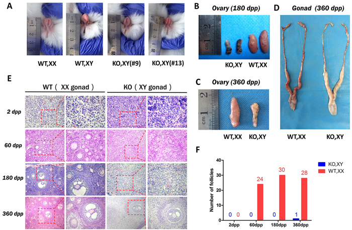 Figure 2: Sex reversal in SRY-Sp1 KO, XY rabbits. A. External genitalia of the KO, XY rabbits and wild type rabbits. WT, XX: wild type female rabbit; WT, XY: wild type male rabbit; KO, XY: the SRY-Sp1 KO rabbit. B. The ovaries of the KO, XY rabbit (#13) and the WT, XX rabbit at 180 days. WT, wild type control. C. The ovaries of the KO, XY rabbit (#18) and the WT, XX rabbit at 360 days. D. The reproductive organs of the KO, XY rabbit (#18) and the WT, XX rabbit at 360 days. E. H&E staining of the ovaries from WT, XX and KO, XY rabbits at different ages. WT, XX, wild type female control. F. Statistical analysis of the follicle numbers in the KO, XY and WT, XX rabbits. WT, XX: wild type female rabbit.