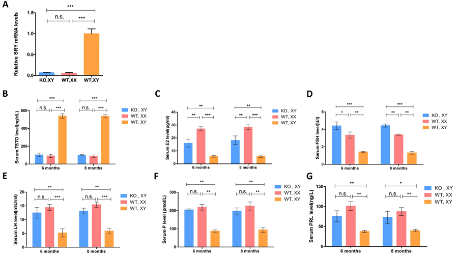 Figure 3: Expression of the SRY gene and sex hormone determination in SRY-Sp1 KO, XY rabbits. A. Expression of the SRY gene was determined by qRT-PCR. A probability of p < 0.05 was considered statistically significant. *, p < 0.05; **, p < 0.01; ***, p < 0.005; WT, XX, wild type female rabbit; WT, XY, wild type male rabbit; KO, XY, SRY-Sp1 KO rabbit. B.-G. Sex hormones were determined using ELISA. The results are presented as the mean±SEM. Data were analyzed with one-way ANOVA using GraphPad Prism software.