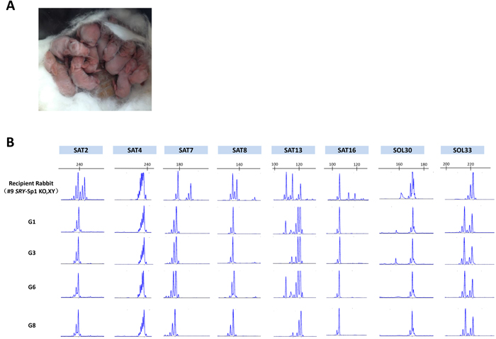 Figure 4: Generation of F1 s using a sex-reversed rabbit as a surrogate. A. Picture of the F1 s from a sex-reversed rabbit. B. Representative microsatellite loci were analyzed in the recipient (#9 KO rabbit), the donor female rabbit and 4 of the pups from recipient rabbit #9 (G1, G3, G6 and G8).