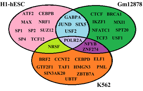 TFs can bind to specific DNA elements and stimulate or suppress gene transcription. There are approximately 1700 to 1900 TFs in human, including 1391 manually curated sequence-specific TFs [5]. In this study, we download respectively available 57, 87 and 96 TFs for H1-hESc (human embryonic stem cells), Gm12878 (B-lymphoblastoid cell) and K562 (erythrocytic leukemia cells) which are immortal [21] and have the most completed data [22]. Then the top 15 TFs which are vital TFs for predicting gene expression levels are chosen by using stepwise regression analysis (the usage about stepwise regression analysis is detailed in Supplementary information), and regarded as the “optimal” TFs for each cell line (shown in Figure 1). We observe that different “optimal” TFs are needed for different cell lines, indicating TFs binding is a dynamical process that depends on tissues or cell lines. A likely explanation for these phenomena may be the essential difference among the three cell lines, necessitating the selection of alternative TFs [2].