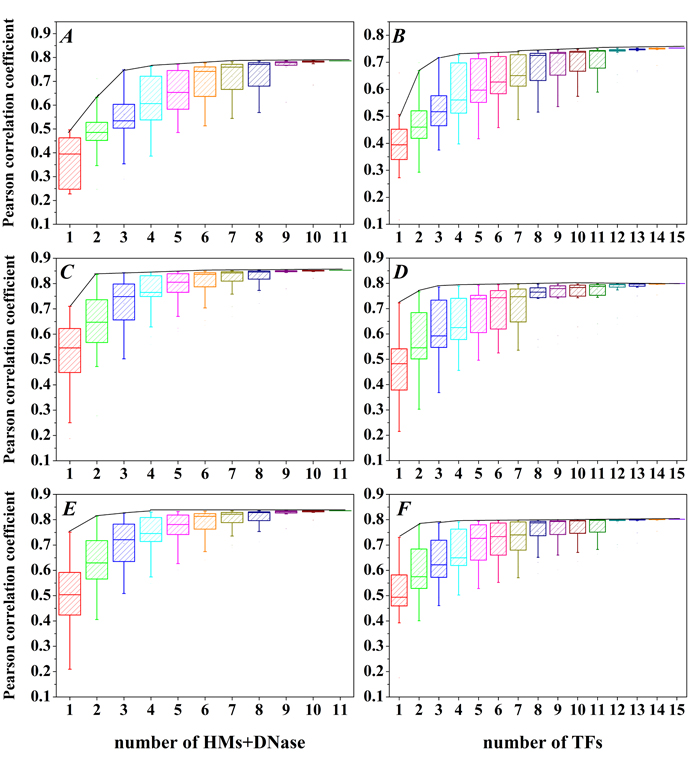 Figure 2: The PCC distributions for all combination of 15 TFs or 10 HMs and DNase. A., B. H1, C., D. Gm12878 and E., F. K562 cell line. X-axis represents the combination of c kinds of HMs and DNase (choose c out of 10 HMs and DNase, c = 1,2,…,11) or d kinds of TFs (choose d out of 15 TFs, d = 1,2,…,15), and the black curves represent the maximum PCC for the combination mode of c HMs and DNase or the combination mode of d TFs.