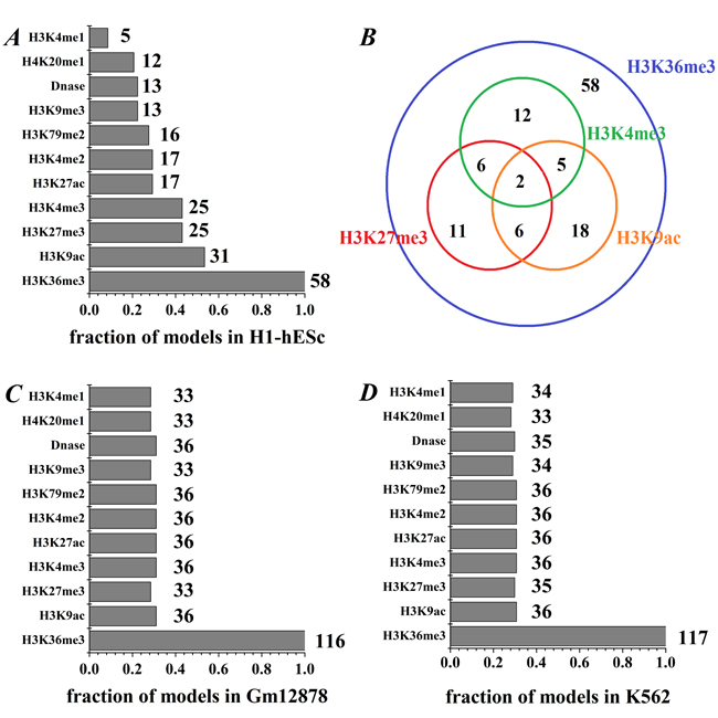 Secondly, for the H1-hESc, each of H3K9ac, H3K27me3 and H3K4me3 appears in nearly half of the 58 combination modes (53.45%, 43.10% and 43.10%, respectively), while other HMs appear in at most 29.31% of 58 modes (shown in Figure 3A). Thus, H3K9ac, H3K27me3 and H3K4me3 are more reliable information parameters than other HMs in H1-hESc, which consist with previous study [23]. Furthermore, we check the times that H3K9ac, H3K27me3, H3K4me3 and H3K36me3 appear together (shown in Figure 3B). We notice that H3K4me3 and H3K9ac appear simultaneously only seven times in the 58 modes, it may be that the information they represented are not simultaneously needed in 58 modes because their information redundancy, which is supported by the high correlation (PCC = 0.905). H3K4me3 and H3K27me3 (H3K27me3 and H3K9ac) occur together eight times in the 58 modes, and the correlation between H3K4me3 and H3K27me3 (H3K27me3 and H3K9ac) is PCC = 0.507 (PCC = 0.502), suggesting that they are partially redundant. However, we find H3K36me3 combines with one of H3K4me3, H3K27me3 and H3K9ac respectively appear in 23, 25 and 31 times, showing that the information they provide may be non-redundant. In fact, the correlations respectively are PCC = 0.097, PCC = 0.203 and PCC = 0.202.