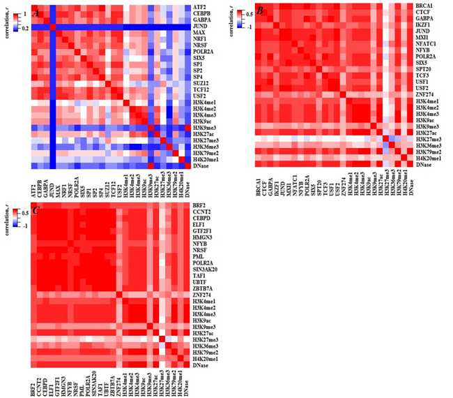 Figure 4: Heatmaps of PCC both within TFs (HMs) and between TFs and HMs for the three cell lines. A., B. and C. represent H1, Gm12878 and K562 cell lines, respectively.