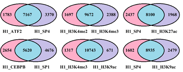 Figure 5: Venn diagram shows the number of the co-regulated and solo-regulated genes within and between TFs and HMs. The blue depicts the co-regulated target genes, the pink and purple represent solo-regulated genes by factors attach to the charts, respectively.