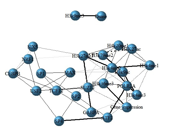 Figure 6: The interaction network among TFs, HMs and gene expression for H1 cell line. In the network, nodes represent TFs, HMs and gene expression. Edges show the partial correlation coefficient between each paired factors, where the dash lines represent negative correlations and solid lines represent positive correlations. Bolder the line is, the stronger correlation it represents.