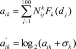 where Nkij is computed by Eq.(1), Fk is the normalized Gaussian kernel density function, where the bandwidth is calculated by the rule of thumb [58]. dj is a relative distance between the midpoint of the j-th bin and the corresponding gene’s TSS, the σk is a pseudocount (the detailed information is displayed in supplementary information). For 19120 genes and 15 TFs, the TFAS profiles are denoted by the 19120×15 matrix a (the matrix element is
