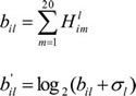 where Hlim is computed by Eq.(2), the σi is a pseudocount, the HMAS profiles are denoted by the 19120×11 matrix b (the matrix element is