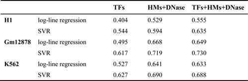 The presences or absences of some TFs and HMs are correlated with gene expression levels [1, 16, 20, 23]. To better understand the relations between TFs (HMs) and gene expression levels, we construct log-linear model and non-linear SVR model for three immortalized human cell lines: H1-hESC, GM12878 and K562. The predictive power (R2) of the two models in 10-fold cross-validation are shown in Table 1 and Supplementary file Table S1.