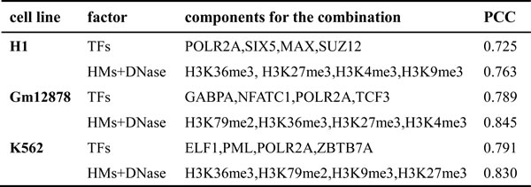 In order to check whether all HMs (TFs) are equally important for predicting gene expression, we construct SVR models for all possible combinations of 10 HMs and DNase or 15 TFs, which results in 2047 HMs+DNase combination modes and 32767 TFs combination modes. The detailed information and statistical results are depicted in Supplementary tables 1-6 and Figure 2. The distributions of Pearson correlation coefficient (PCC) for these 2047 HMs+DNase combination modes in the H1-hESc, GM12878 and K562 are respectively shown in Figure 2A, 2C and 2E). The distributions of PCC for these 32767 TFs combination modes in the H1-hESc, GM12878 and K562 are shown in Figure 2B, 2D and 2F). The maximum PCC for combination modes of different amounts of HMs or different amounts of TFs is connected by a black curve. It is found that the predictive powers will basically reach summit in the maximum combination of four HMs or four TFs. The combination modes of maximum prediction accuracy for the four factors (i.e. four HMs or four TFs) are described in Table 2. These results show that all HMs+DNase or TFs are not equally important and there are statistical redundancies within HMs (TFs).