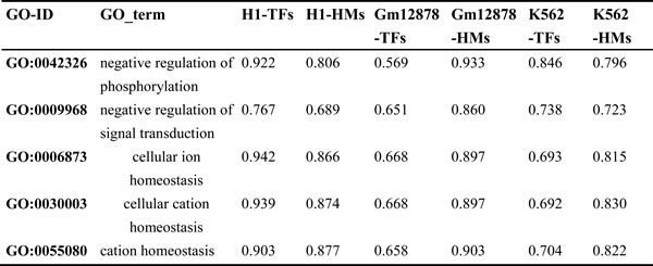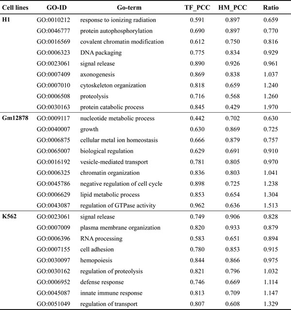 Table 4: List of five random GO-ID where TFs and HMs model show distinct PCC for the same biological process in the different cell lines.