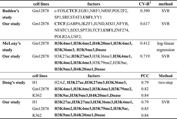 The next-generation sequencing technology [35] provides large numbers of data that enable a more intensive research the interaction among TFs, HMs and DNA to be possible. Through a series of analyses and researches, the following interesting results can be put forward: (1) The selected TFs obtain better predictive than previous studies. Budden et al. [2] investigated the relation between core TFs and gene expression in Gm12878 by using similar method, their predictive accuracy was only CV-R2 = 0.390. But the predictive accuracy is CV-R2 = 0.617 in our study, this conclusion indicates that TFs studied in our paper may contain more information than those core TFs or can functionally substitute for some core TFs. The compared results are shown in Table 5. (2) Based on SVR model, the relationships between HMs and gene expression are investigated in Gm12878, and better results are obtained. For instance, McLeay et al. [36] studied the effects of 7 HMs and DNase on gene expression by a log-linear regression model, their predictive accuracy is CV-R2 = 0.412, but the predictive power in our study is CV-R2 = 0.719, which further imply a non-linear relations between HMs and gene expression. Dong et al. [24] constructed a two-step model to predict genes expression levels, they only use the chromatin feature density of ‘bestbin’ as predictor which ignores the information in other bins. Comparing with their accuracy PCC = 0.82, we achieve PCC = 0.85. The compared results are shown in Table 5. (3) In section 2.3 and 2.6, we and others observe that POLR2A, H3K4me3 and H3K27me3 can activate or inhibit gene expression [27, 28, 36-38], these not only show the obtained conclusions are accurate, but also indicate our model and methods may be reasonable.