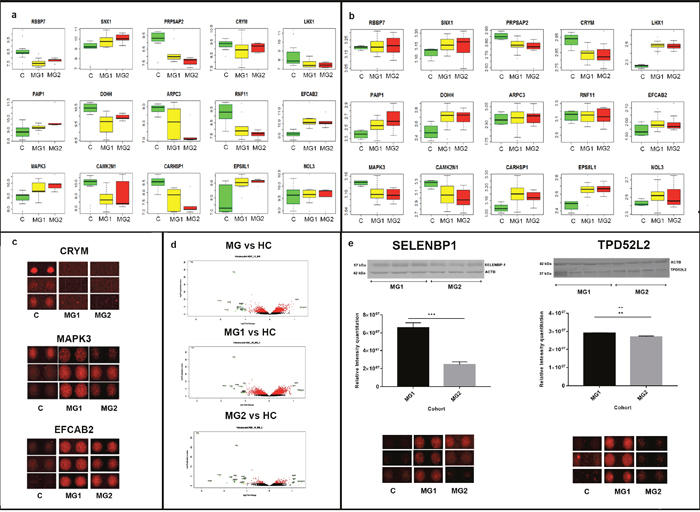 Upon using a higher threshold; log2 fold change cut off of greater than or equal to 1 with a corrected p-value less than 0.05; we found a set of 21 significantly dysregulated autoantibodies in MG vs HC, similarly 20 autoantibodies that were dysregulated in MG1 vs HC and 23 autoantibodies in MG2 vs HC (Table 1, Supplementary Table 4.1). Among these, EFCAB2, EPS8L1, LOC285382 proteins were found to be upregulated while a majority of others like IGHG4, CRYM, TIRAP, C17orf57 were found to be downregulated in all the comparisons. We documented the signal intensities of each of these proteins qualitatively by observing each feature for its morphology (Supplementary Figure 1). The intensities of each protein were visualized using box plots and their ability to distinguish between cohorts was assessed using heat maps (Supplementary Figures 2 and 3).