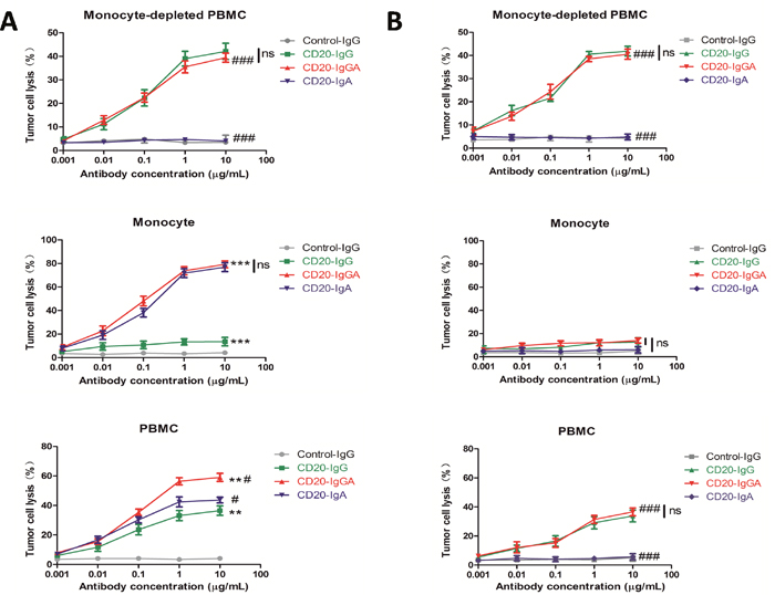 Figure 1: ADCC with different mouse effector cells ex vivo. ADCC results are shown using Raji cells as targets and the mouse monocyte-depleted PBMC fraction, isolated CD14+monocytes, or PBMCs (E:T = 40:1) from FcaRI Tg mice (A) or wild-type C57BL/6 mice (B) in the presence of anti-CD20 antibodies. For monocytes and PBMCs, a 20-h ADCC assay was used. For monocyte-depleted PBMCs, a 4-h ADCC assay was used. All data are presented as the mean ± SEM (n = 3) from one of three representative experiments. *CD20-IgGA group versus CD20-IgG group; #CD20-IgGA group versus CD20-IgA group. **P < 0.01; ***P < 0.001; #P < 0.05; ###P < 0.001; ns, not statistically significant by two-way ANOVA.