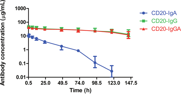 Figure 3: Serum half-life of anti-CD20 antibodies in C57BL/6 mice. Serum levels for CD20-IgG (green), CD20-IgGA (red), and CD20-IgA (blue) in C57BL/6 mice (n = 6/group) were quantified by ELISA for detection of human IgG and IgA. Mice were intravenously (i.v.) injected with 100 μg anti-CD20 antibodies, and blood samples were collected at the indicated time points.