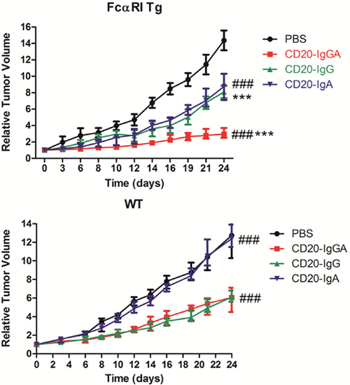 Figure 4: Comparison of the efficacy of anti-CD20 antibodies in the LLC-CD20 xenograft model. FcαRI Tg (A) or WT (B) C57BL/6 mice were injected s.c. with 1 × 106 LLC-CD20 cells. Mice bearing xenografts (tumor size ~100–150 mm3) were administered 5 mg/kg CD20-IgG and CD20-IgGA (n = 6–8/group) via i.v. injection on days 0, 4, 8, 12, 16, and 20 or 5 mg/kg CD20-IgA daily from day 0 to day 23. *CD20-IgGA-treated group versus CD20-IgG-treated group; #CD20-IgGA-treated group versus CD20-IgA-treated group. ***P < 0.001 and ###P < 0.001 using two-way ANOVA.