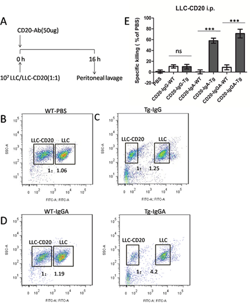 Figure 5: Macrophages mediated in vivo anti-CD20 antibody activity in a peritoneal model using LLC-CD20 cells. (A) The LLC-CD20 i.p. model was generated by injection of a 1:1 mixture of LLC and LLC-CD20 cells (1 × 107 cells) differentially labeled with high and low concentrations of CFSE into the peritoneum of FcαRI Tg or WT BALB/c mice (n = 6/group). Immediately after injection of the cells, the mice received 50 μg anti-CD20 antibodies. After 16 h, the peritoneum was washed, and the ratios of CSFE+LLC to CSFE++LLC-CD20 cells were analyzed to calculate specific cytotoxicity. (B–D) Representative dot plots showing cells retrieved from the peritoneum. LLC and LLC-CD20 cells could be identified based on CFSE labeling. (E) Specific cytotoxicity was calculated from the ratio of LLC to LLC-CD20 cells in each treatment group. ***P < 0.001; ns, not statistically significant using unpaired two-tailed t tests.