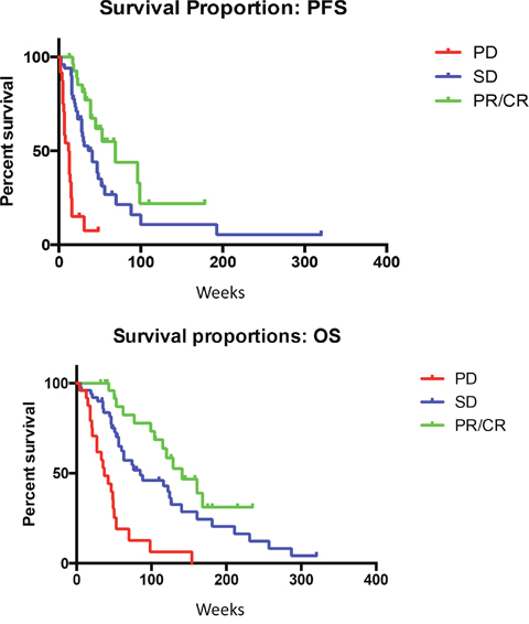 Figure 1: (A) Median PFS is significantly improved for patients with RECIST responses (P-value for the trend =0.0004). (B) Median OS is significantly improved for patients with RECIST response (P-value for the trend =0.0005).