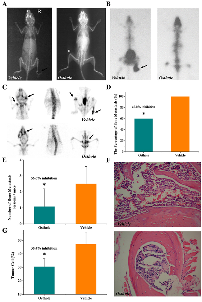 Figure 1: Osthole-mediated inhibition of breast cancer bone metastasis in mice. (A) Radiograph images. (B) Whole-body bone scintigraphy images. (C) Pinhole bone scintigraphy images (arrows indicate sites of bone metastases). (D) Osthole diminished the incidence of bone metastasis (* p < 0.05 by the Fisher exact test). (E) Osthole reduced bone metastasis lesions (* p < 0.05 by ANOVA). (F) Representative images of osseous metastases. (G) Quantitative histomorphometry measurement of tumor burden in bone lesions (* p < 0.05 by ANOVA). Mice received an intracardiac injection of MDA-231BO cells, resulting in osseous metastases as detected by radionuclide bone scintigraphy and X-ray imaging within 2 weeks of tumor inoculation. The mice were then randomly divided into 2 groups (n=10 per group) that received either oral osthole (5.25 mg/kg) or vehicle twice weekly for 6 weeks. Every two weeks following inoculation, bone metastasis was evaluated by in vivo imaging with radiographs and radionuclide bone scintigraphy. Mice were sacrificed at the end of treatment, and metastatic bone lesions, observed by radionuclide scintigraphy and radiography, were sectioned and sent for H&E staining (magnification: 200X).